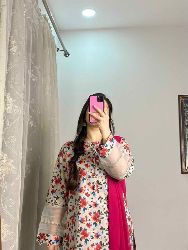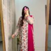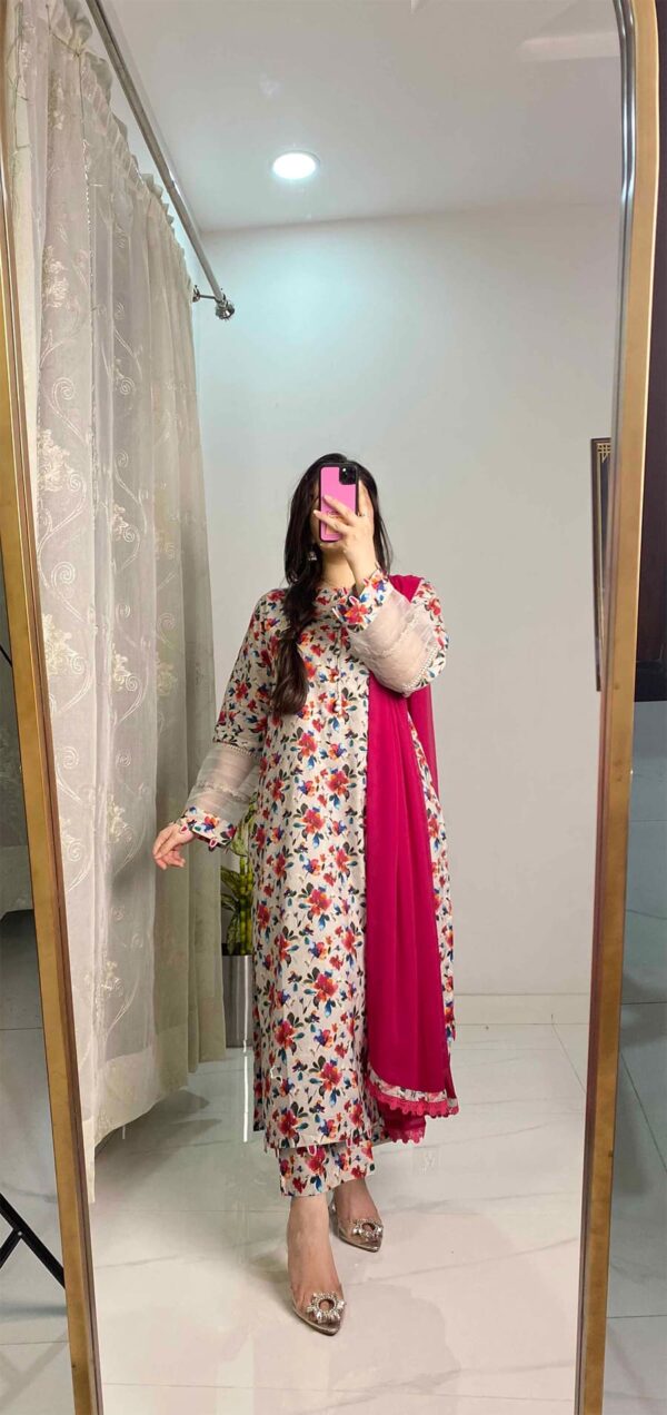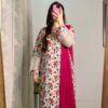 Bahaar is a refreshing 3-piece stitched suit featuring a soft ivory base adorned with vibrant multicolored floral prints. Paired with a deep magenta chiffon dupatta and delicate lace detailing, this look is a perfect blend of grace and cheer—ideal for both casual and semi-formal days.