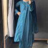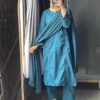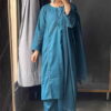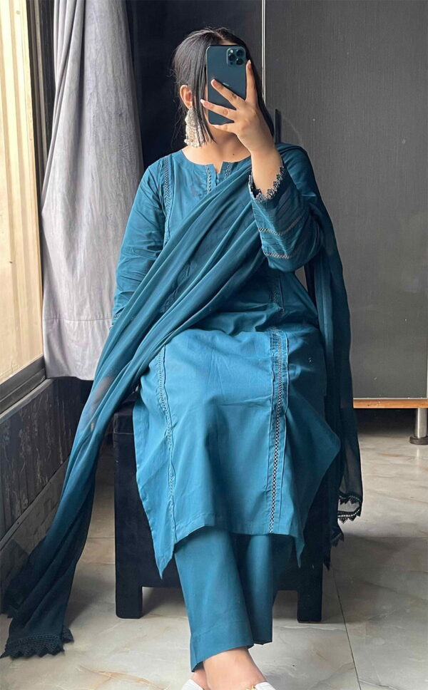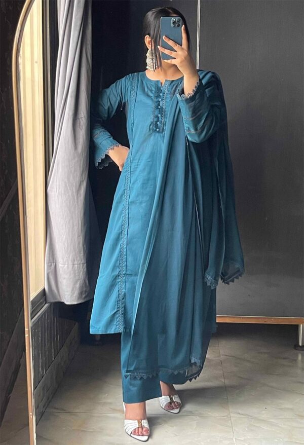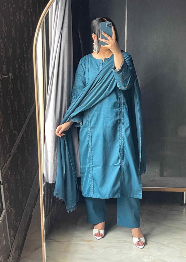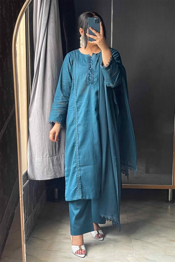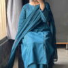 A timeless teal 3-piece stitched suit featuring subtle lace accents and minimal detailing. Crafted for comfort with a graceful fall, it’s your go-to pick for both casual sophistication and soft festive looks.